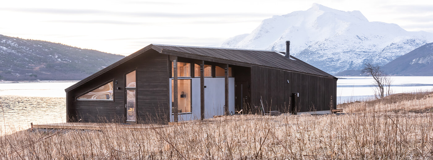 Es ist schon eine Weile her, so berichtet das Paar, dass sie das Haus vom Modell Gapahuk gefunden haben, welches ein Entwurf des bekannten norwegischen Architekturbüros Snøhetta ist. Das Haus in der Kommune Tjeldsund liegt bloße 55 m weit vom Meer entfernt in einer Gegend, in der die Wikingerzeit noch sehr präsent ist. Dies wird durch viele Fundstücke bezeugt, die von einer schon frühen Besiedlung und deutlichem Wohlstand bis ins Mittelalter künden. In diese raue, doch in ihrer Schlichtheit auch schöne Landschaft, die von hohen Bergen umgeben ist, passt das Hausmodell Gapahuk perfekt hinein.
