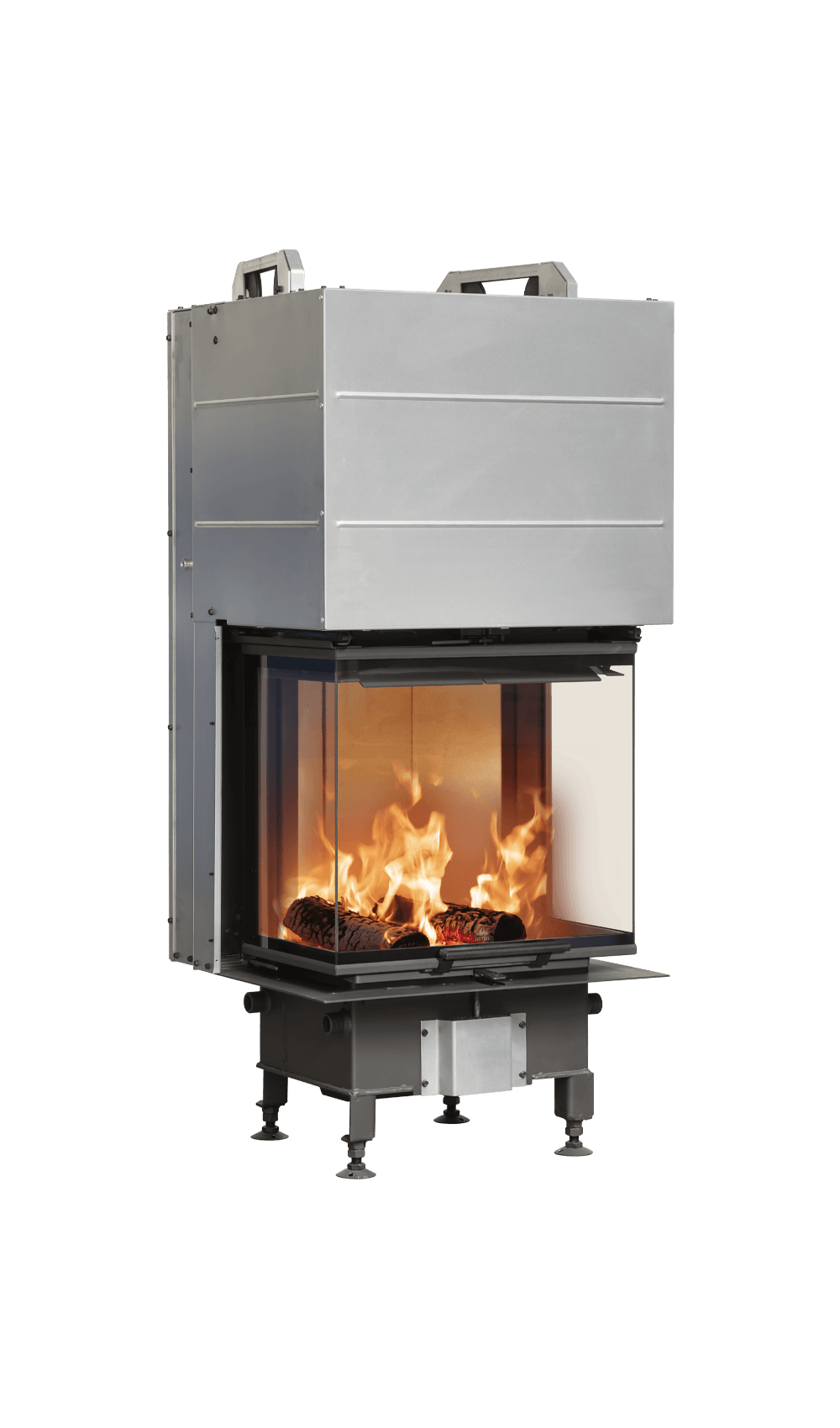 Kamineinsatz mit drei Glasflächen – dadurch mit einem freien Blick auf die Flammen aus allen Ecken des Raumes. Dieser Kamineinsatz eignet sich auch für weniger große Flächen und lässt sich daher auch in kleinen Wohnstätten einbauen. Die selbstschließende Tür hebt und senkt sich beim Bedienen, was das Einlegen von Holz erleichtert und einen sicheren Gebrauch gewährleistet. Dieser schöne Einsatz ist in jedem Zimmer ein echter Blickfang, und er lässt sich in vielerlei Weise individuell anpassen. Dank fugenloser Übergänge bleibt der Blick auf die Flammen ungestört.