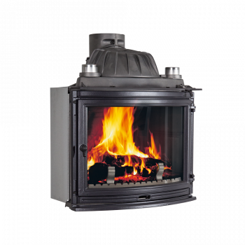 Zeitloser Kamineinsatz aus massivem Gusseisen, mit heller und luftiger Brennkammer. Dieser Kamineinsatz mit sauberer Verbrennung ist mit drei Glasscheiben ausgestattet, die eine gute Sicht auf die Flammen aus mehreren Winkeln im Raum ermöglichen. Luftspülung und Beschichtung der Scheiben machen es einfacher, das Glas sauber zu halten. Benutzerfreundliche Luftregulierung, Schnappschloss in der Tür und Holzfang in der Brennkammer sorgen für ein einfaches und sicheres Feuern. Mit Möglichkeit für Frischluftanschluss kann der Kamineinsatz auch in Niedrigenergiehäusern für optimale Wärme sorgen. Als Zusatzausstattung besteht auf Wunsch die Möglichkeit der Umrüstung der Tür auf Rechtsanschlag.