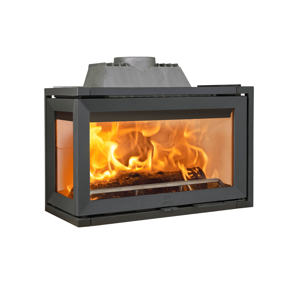 Großer Kamineinsatz mit zwei Glasfenstern und sauberer Verbrennung. Luftspülung und Beschichtung der Scheiben machen es einfacher, das Glas sauber zu halten. Der Kamineinsatz besteht aus massivem Gusseisen, mit hellen Brennplatten aus weißem Vermiculit und verschleißfestem, weiß emailliertem Gusseisen. Benutzerfreundliche Luftventile, Holzfang in der Brennkammer und eine praktische Aschelösung machen das Heizen einfach und sicher. Die Tür ist mit einem Schnappschloss ausgestattet und kann als Zusatzausstattung auf Wunsch auf Rechtsanschlag umgerüstet werden. Für optimale Beheizung in Niedrigenergiehäusern ist ein Frischluftanschluss eingerichtet.