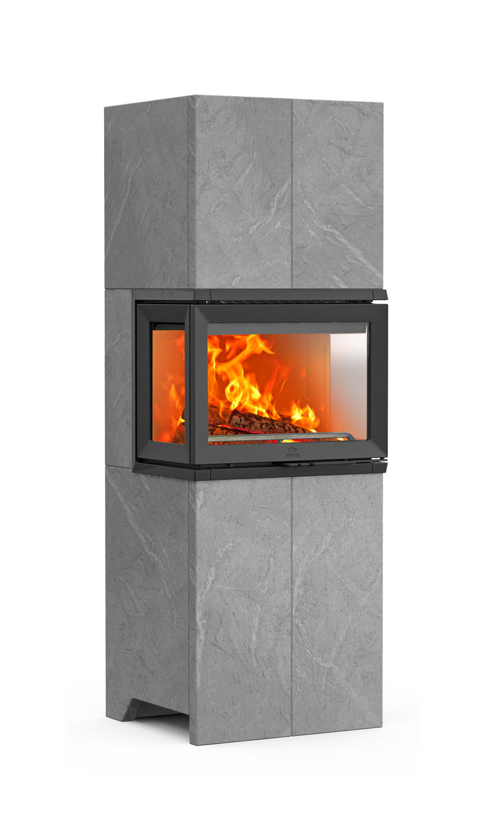 Freistehender und stilvoller Kamin mit Speckstein. Dieser Kamin wurde in Zusammenarbeit mit dem Designer Bård Eker entworfen und hat drei Glasscheiben für eine gute Sicht auf die Flammen sowohl vorne als auch an den Seiten. Der Kamin verfügt über eine Luftspülung und eine Beschichtung auf dem Glas, die bei optimaler Verbrennung für saubereres Glas sorgt. Die Tür hat ein praktisches Schnappschloss und einen Holzfang in der Brennkammer, was das Heizen im Kamin sicher macht. Speckstein ist ein natürliches Material, das Wärme längere Zeit speichern kann. Über ein benutzerfreundliches Ventil auf der Oberseite des Kamins kann gewählt werden, ob die Wärme als Konvektionswärme an den Raum abgegeben oder im Speckstein gespeichert werden soll. Mit Zusatzausstattung ist es möglich, die Tür auf Rechtsanschlag umzurüsten.