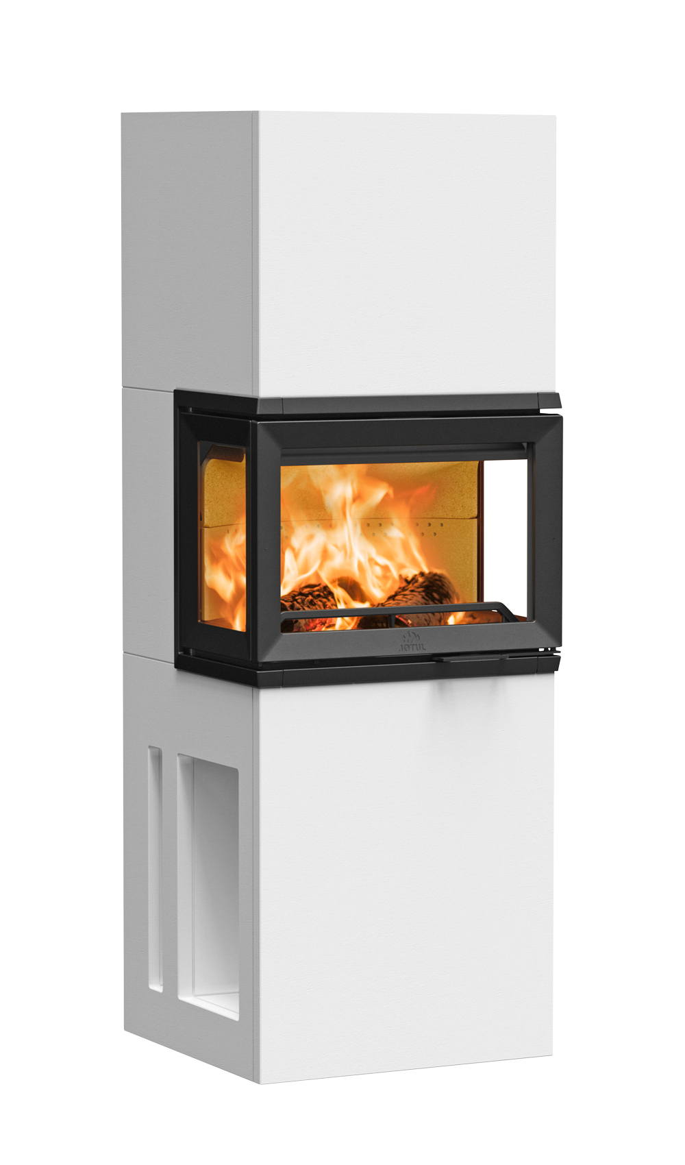 Ein freistehender Kamin mit drei Glasfenstern, der von mehreren Stellen im Raum eine gute Sicht auf die Flammen ermöglicht. Glasbeschichtung und Luftspülung halten die Scheiben bei optimaler Verbrennung sauberer. Der Kamin mit sauberer Verbrennung besteht aus einer maßgefertigten Ummantelung und einem Kamineinsatz, der schnell und einfach zu installieren ist. Die Oberfläche kann sofort nach der Montage in jeder Farbe gestrichen werden. Um dem Kamin Ihre persönliche Note zu verleihen, können Sie auch zwischen einer feineren oder raueren Oberfläche wählen. Mit seinen benutzerfreundlichen Luftventilen, Holzfang in der Feuerkammer und dem Schnappschloss in der Tür können Sie sicher und einfach heizen. Mit Zusatzausstattung ist es möglich, die Tür auf Rechtsanschlag umzurüsten. Trotz seiner großen Brennkammer ist der Kamin so konzipiert, dass er bei geringer Leistung gut brennt. Es besteht auch die Möglichkeit der Wärmespeicherung im Oberteil.