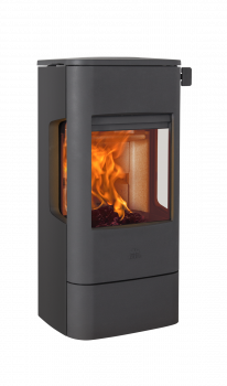 Moderner Kaminofen aus massivem Gusseisen. Der Kaminofen kann in der Nähe einer brennbaren Wand platziert werden und ist auch für Niedrigenergiehäuser mit der Möglichkeit des Frischluftanschlusses geeignet. Dieser von Hareide Design entworfene Kaminofen hat mit seinen einfachen und klaren Linien einen zeitlosen Ausdruck. Er verfügt auch über eine Luftspülung, die das Glas leichter sauber hält. Mit Zusatzausstattung kann der Kaminofen auch an ein bestehendes Rohr und Standard-Stahlrohr ohne Zuluft montiert werden. Ein praktischer Türmechanismus mit Magnetverschluss und der oben auf der Tür angebrachte Kaltgriff erleichtern die Bedienung des Kaminofens.